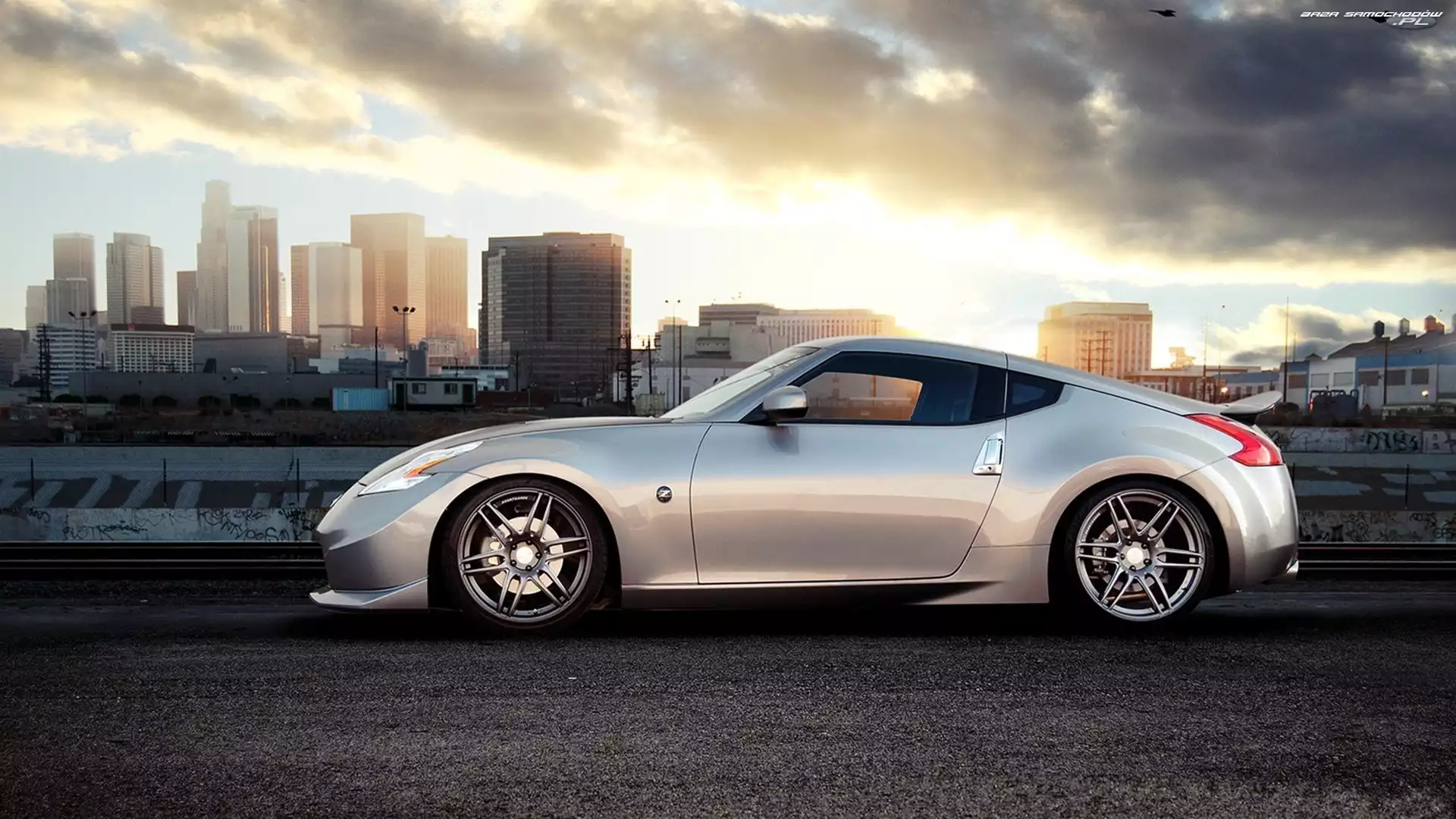 Chmury, Miasto, Srebrny, Samochód, Nissan 370z- Zdjęcia samochodów